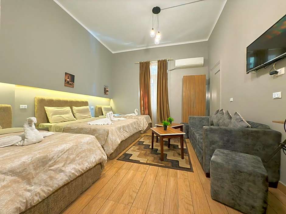 The family room provides air conditioning, a mini-bar, as well as a private bathroom featuring a shower and a bidet. This family room features parquet floors, a carpeted floor, a flat-screen TV with satellite channels and city views. The unit offers 3 beds.